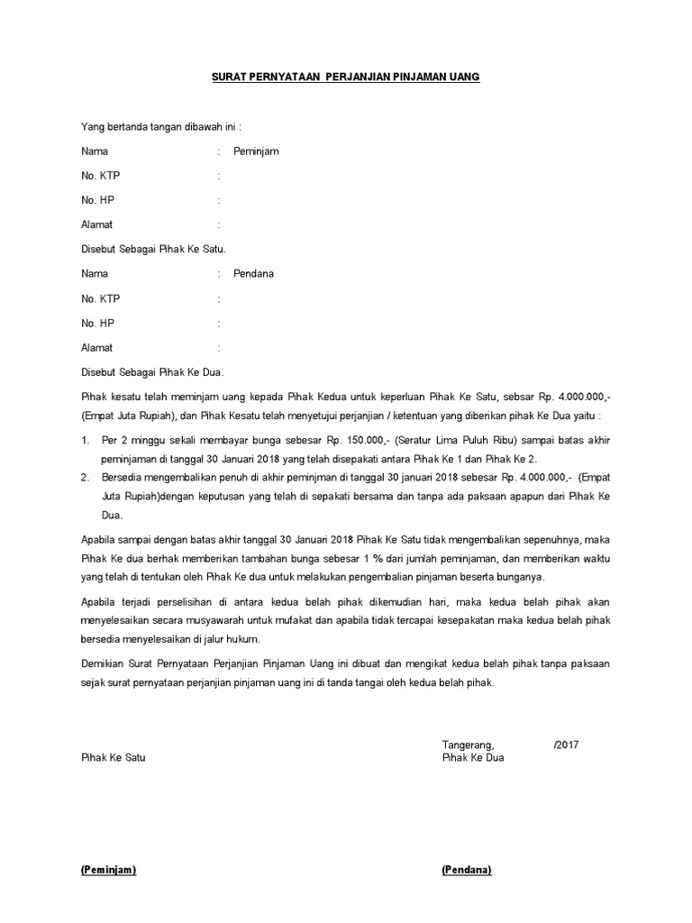 Surat Perjanjian Pinjaman Wang - Pada hari ini jumat tanggal 04 (empat) bulan agustus agustus tahun 2017 2017 (dua ribu tujuh b<b>las) b<b>las) !ami ang b<b>rtanda.. Yang bertanda tangan di bawah ini na ma. Berbeda dengan perjanjian yang dibuat secara tertulis, dimana sudah jelas tertulis mengenai peran dan tanggung jawab dari pihak pertama bersedia memberikan barang jaminan yakni surat rumah, yang nilainya dianggap sama dengan uang pinjaman kepada pihak. Perjanjian pinjaman uang wajib dituangkan dalam bentuk tulisan, mengingat uang sangat rawan. Bogor disebut pihak kesatu telah meminjamkan uang kepada pihak kedua untuk keperluan pengadaan pakaian forum kerukunan umat bersama. Cara tulis dan sediakan surat perjanjian pinjaman sendiri.