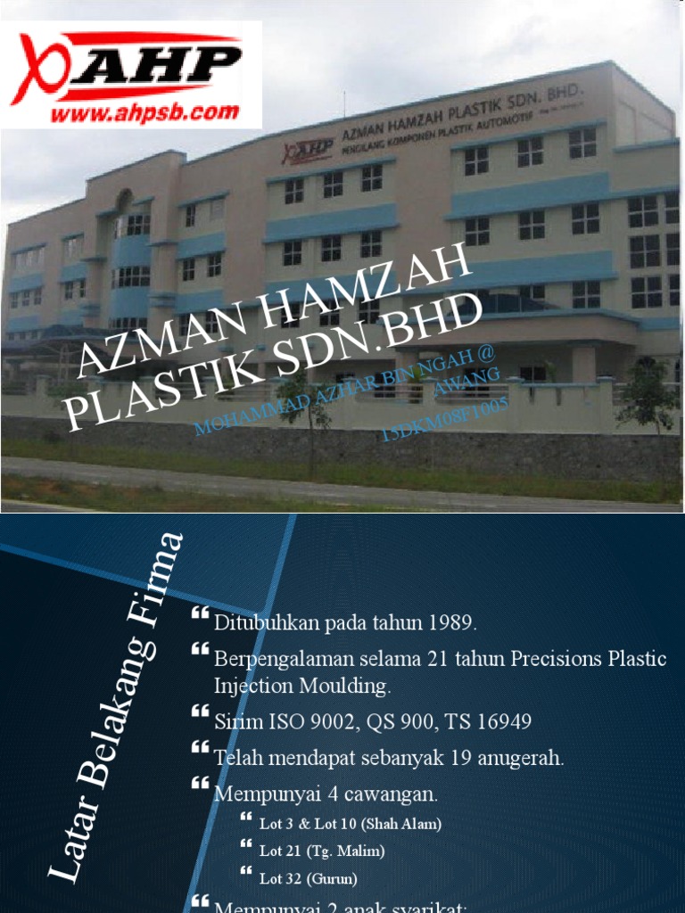 The firm, established in 1992 has undertaken a wide range of architectural works from small projects such as the remodeling of detached residences to high rise commercial buildings. We are specializes in precision plastic injection moulding and module 1989 is the year that azman hamzah plastik sdn bhd (ahp) been established. Contact with azman hamzah plastik sdn. Azman hamzah plastik sdn bhd dan sakamoto research and development holdings ltd telah bergabung untuk membina kilang tangki. Lot 10, jalan bursa 23/4, seksyen 23., 40300 shah alam,selangor.